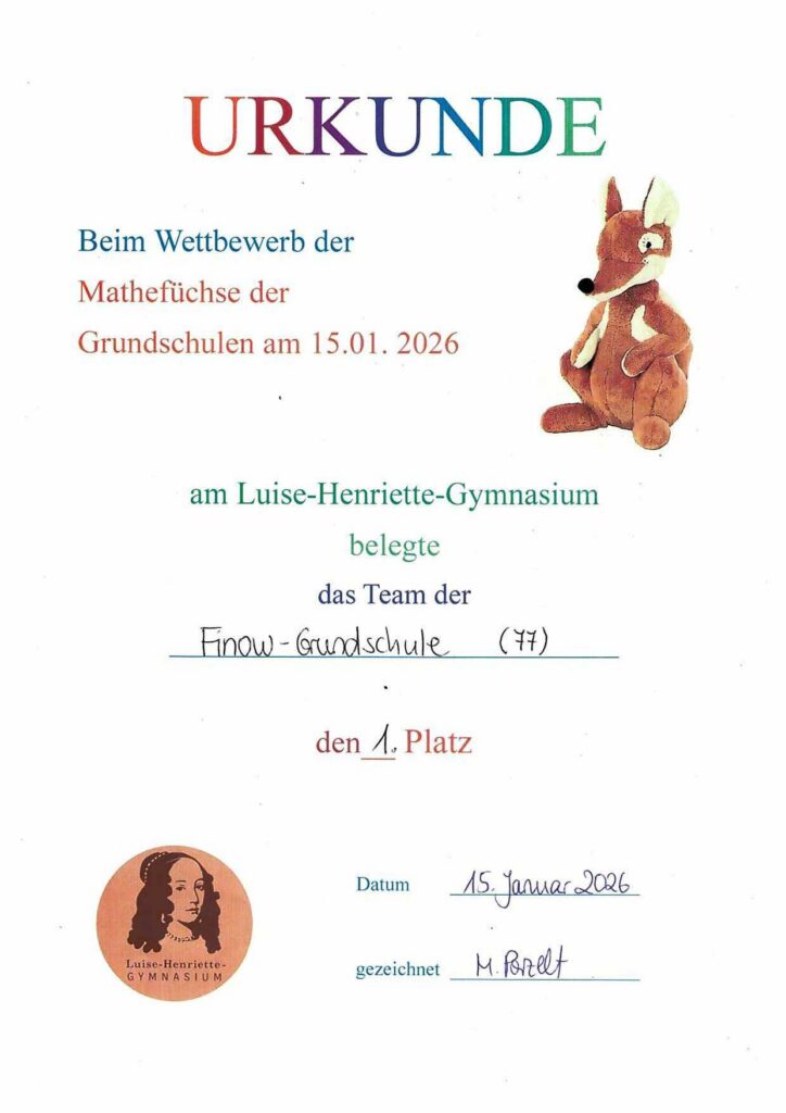 Beim Wettbewerb der Mathefüchse der Grundschulen am 15.01.2026 am Luise-Henriette-Gymnasium belegte das Team der Finow-Grundschule den 1. Platz.